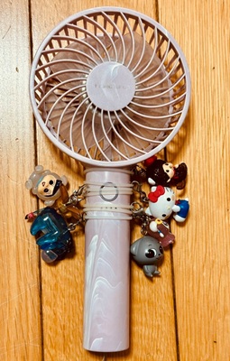 このめじるしアクセサリーは持ち物に付ければ自分の物だとわかりやすくするということで傘の柄につける人が多かったようですが、私が思っていた以上に使い方は様々。鍵のキーフォルダーや文房具ペンに。またお子さんの水筒にも。ちなみに我が家の場合は小型扇風機の持ち手につけています。かなりの数のキャラクターアクセサリーがついていて、ボタンを押す位置が隠れるほど。扇風機の使い勝手が悪いんじゃないかと思いつつも、使用している本人は満足そうなので良しとしていますが…。(30年位前のガラケーにつけていたストラップ類を思い出してしまうのは私だけ?)つけているキャラクターの中にはモンチッチもいます。懐かしい!